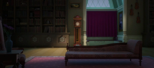 Biblioteka została po raz pierwszy pokazana na początku filmu, gdy Agnarr szukał informacji o trollach. Następnie pojawiła się w piosence "ulepimy dziś bałwana?", podczas gdy dziewięcioletnia Anna śpiewała tu fragment zwrotki, leżąc na plecach i patrząc na zegar w pokoju. Później, podczas piosenki "pierwszy raz jak sięga pamięć", Elsa ćwiczyła tutaj trzymanie kuli i berła na koronację, stosując świecznik i szkatułkę jako zamienniki relikwii. Po trzymaniu przedmiotów przez kilka sekund zaczęła niekontrolowanie pokrywać je warstwą szronu i szybko odłożyła je na stół. Trenując, przyglądała się portretowi swojego zmarłego ojca.