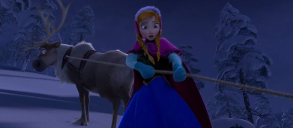 Sven displayed concern for the princess in two particular instances: He persuaded Kristoff to continue accompanying Anna on her journey on the pretense that she would "die on her own". Sven also displayed reluctance in leaving Anna to her fate in Arendelle and stopped Kristoff from leaving the area, urging the ice harvester to turn back. He later carried Kristoff back to the castle, placing himself at risk so that the ice harvester could reach Anna. The reindeer was visibly downcast when he saw Anna's frozen form and expressed delight at her thawing.