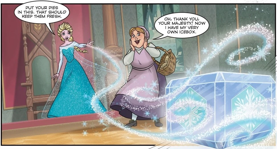 Tilda wasn't being able to keep the pies fresh, so she searched Elsa for help. The queen made her a huge icebox to keep the pies until they are sold.[1]