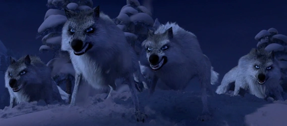 The wolves are formidable predators who incorporate stealth, speed, and precision in their attacks. They hid under the cover of darkness while pursuing Kristoff's sled, and after revealing themselves, they were able to keep pace with Sven. During their assault on the sled, the wolves coordinated a series of strikes, finally managing to separate Kristoff from the vehicle.
